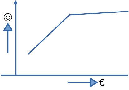 We willen telkens meer, maar vanaf een bepaald inkomen (orde 75.000 Euro/jaar) voegt meer inkomen weinig geluk toe aan je leven. Eerst moeten basisbehoeften geregeld zijn (veiligheid, dak boven je hoofd, eten en drinken, …), daarna komen luxere behoeften voor in je vrije tijd. Een grote dure auto went snel en is daarna ook weer gewoon (maar kost veel meer grondstoffen, arbeid en geld). 1000 euro voor een rijke heeft weinig extra effect, maar 1000 euro voor een arme ontzorgt enorm.